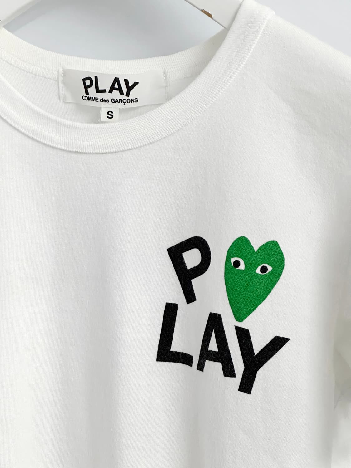 2006 Comme des Garcons PLAY green heart logo t-shirt💚 일본을 대표하는 아방가르드 브랜드 꼼데가르송의 인기 서브라인인 PLAY 컬렉션의 반팔 티셔츠입니다👀 화이트 컬러의 베이직한 바디에 PLAY 특유의 아이코닉한 초록 하트 아이 로고와 “PLAY” 레터링이 프린트된 디자인으로, 심플하면서도 브랜드 정체성이 잘 드러나는 아이템입니다✨ 레드 하트 디자인에 비해 유통량이 적어 상대적으로 더 희소성이 높은 제품이며 소매 끝과 밑단에 싱글 스티치 봉제 기법으로 마감되어 있습니다🪡 데님 팬츠, 치노 팬츠, 혹은 슬랙스와 매치하여 다양한 스타일링이 가능하며, 꼼데 특유의 미니멀 감성과 위트를 동시에 즐길 수 있는 아이템입니다🪄 우수한 컨디션으로 입고 되었으며, 전문 클리닝 완료한 제품 입니다🫧 size - 실 우먼 S (표기 S) (어깨-36cm, 가슴-39cm, 총장-56cm, 팔-16cm)