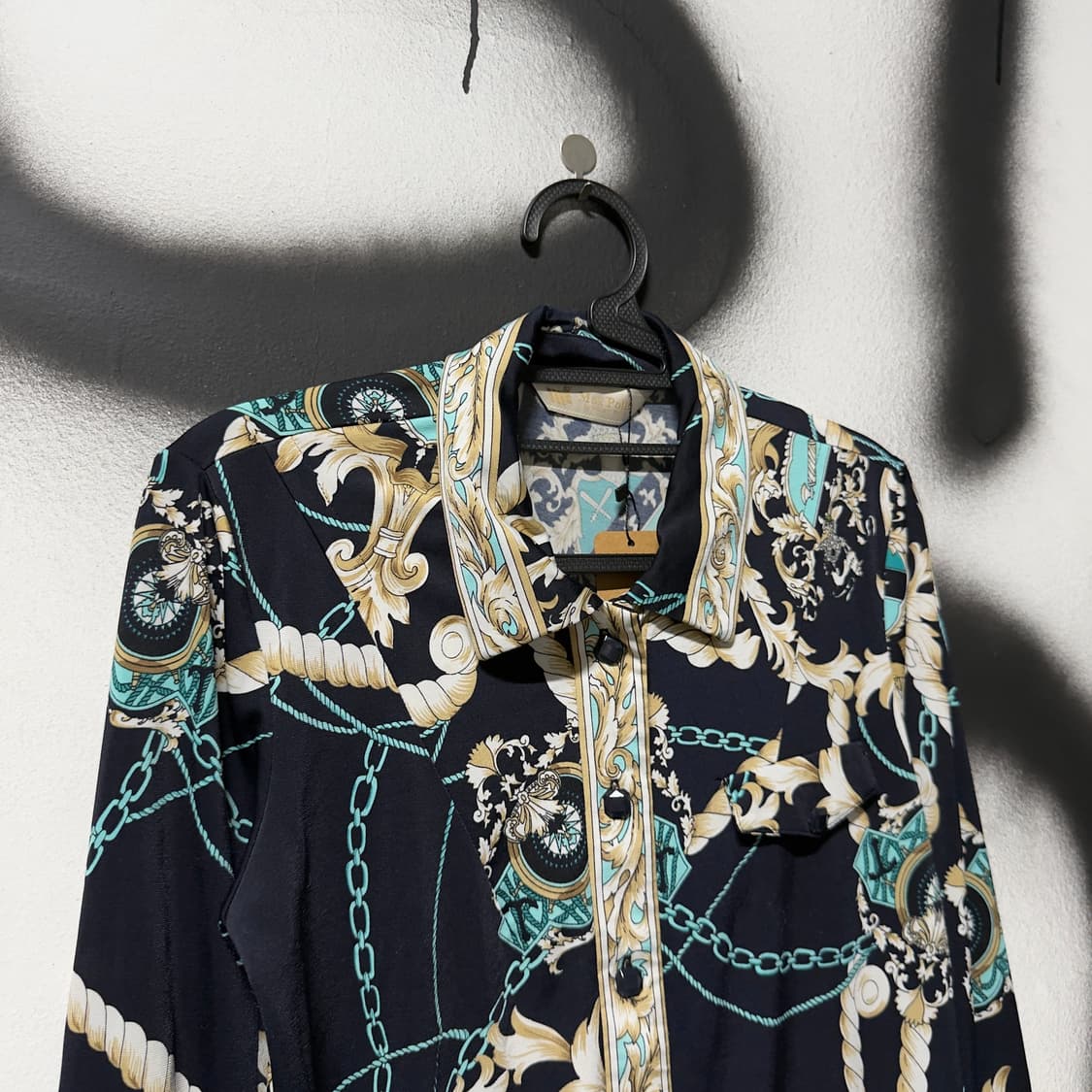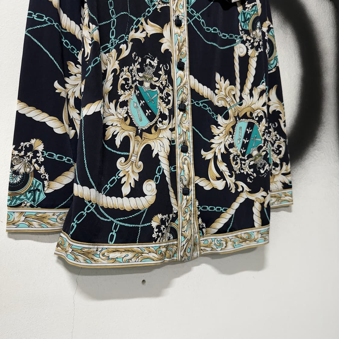 신축성이 좋은 소재로 제작된 전면 바로크 패턴이 들어가있는 긴팔 셔츠입니다. 마른 남성분들 또는 여성분들이 착용하기 좋은 사이즈 입니다. 어깨 : 44 가슴단면 : 48 총장 : 64 모든 치수는 센치 기준입니다. 여러상품 혹은 쿨거래시 할인 가능합니다!