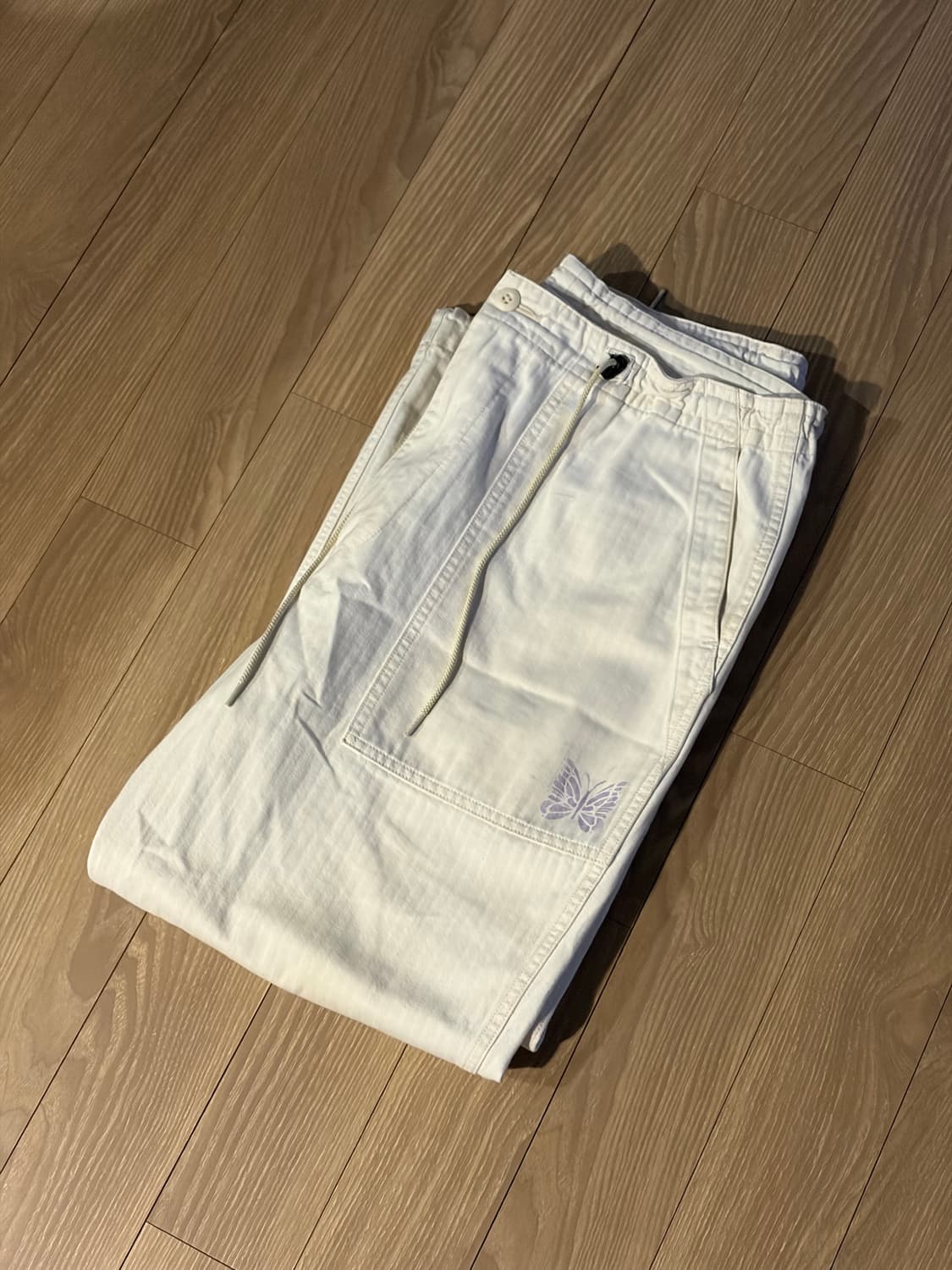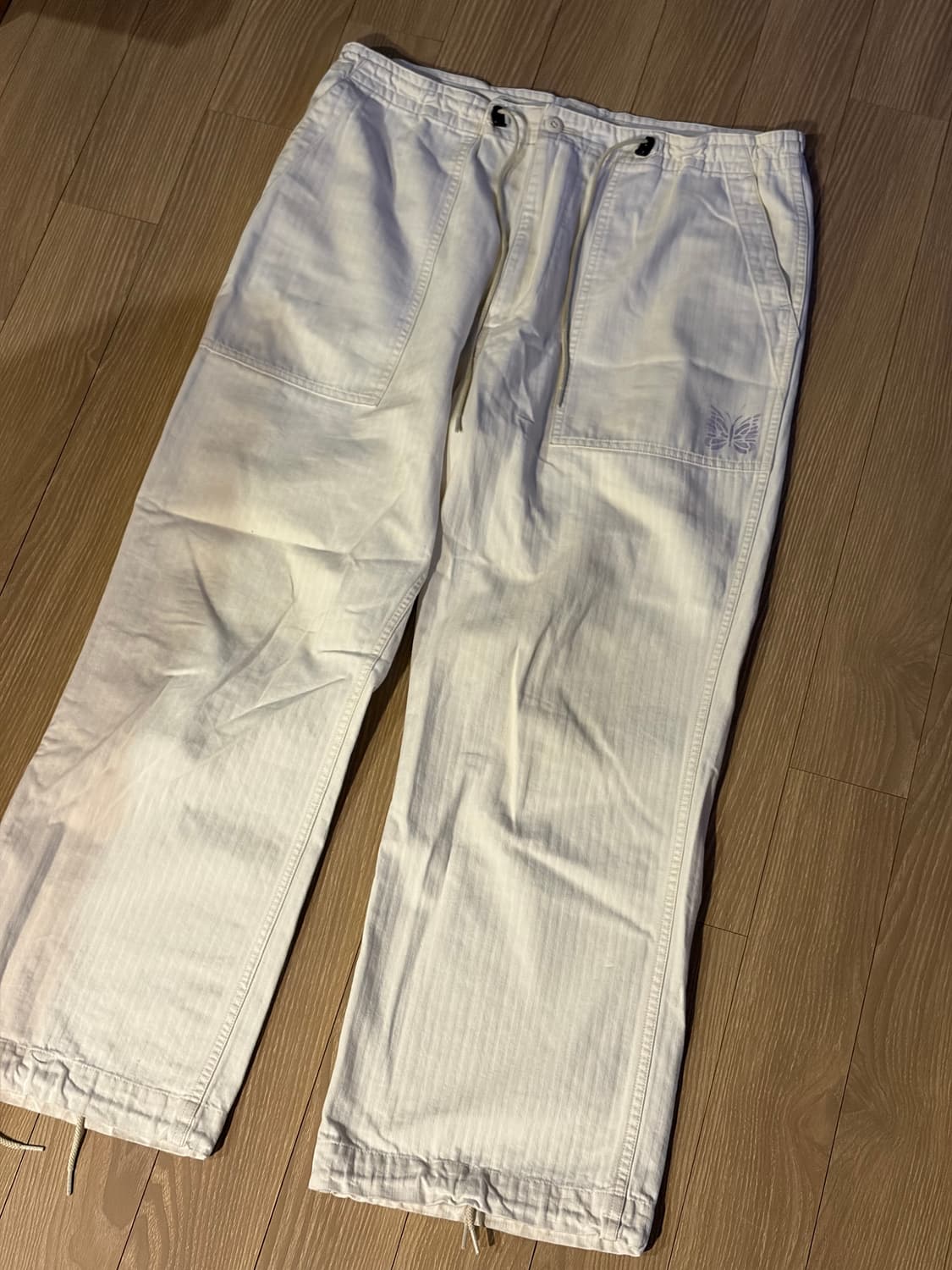니들스 퍼티그 스트링 팬츠 L 사이즈 스트링으로 조절가능해서 사이즈 폭이 큰게 장점입니다 176/72 착용 적당히 오버핏 나옵니다 사용감 살짝 있으며 드라이 할정도는 아니라고 생각합니다 그외 이상 없습니다!