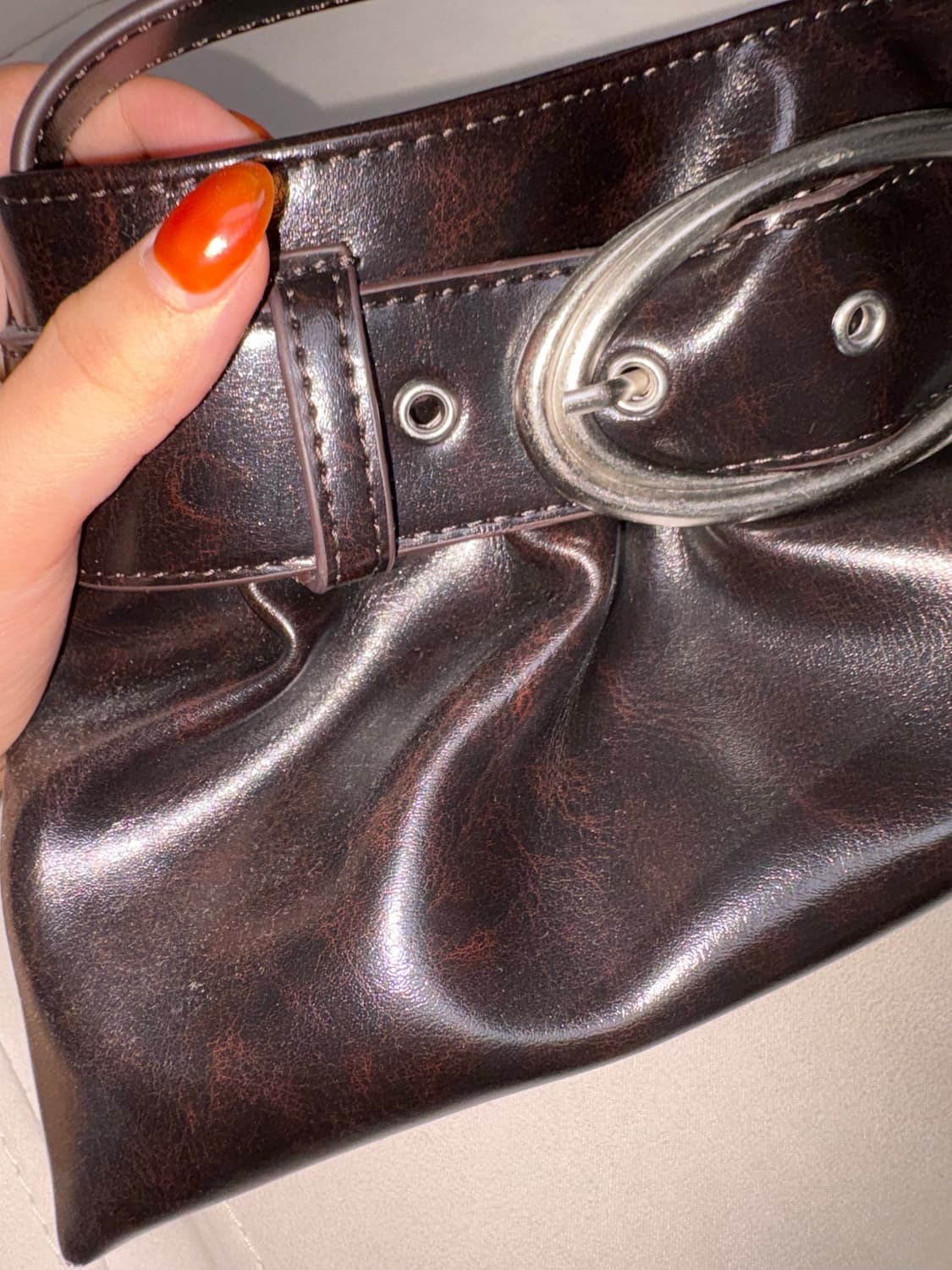 큐리티 벨티드 호보 백 브라운 컬러 딱 한번 착용하고 나가서 스크래치나 별도 손상없이 상태 아주 깨끗합니다. 브라운 컬러인데 가까이서 보면 마지막 사진처럼 오묘하게 컬러가 섞여있는게 매력적인 호보백입니다! 정가 92000 사용감 거의 없는 제품인데 얼른 처리하려 반값에 올립니다,, 문의주실 부분 있으시면 따로 채팅주세요!