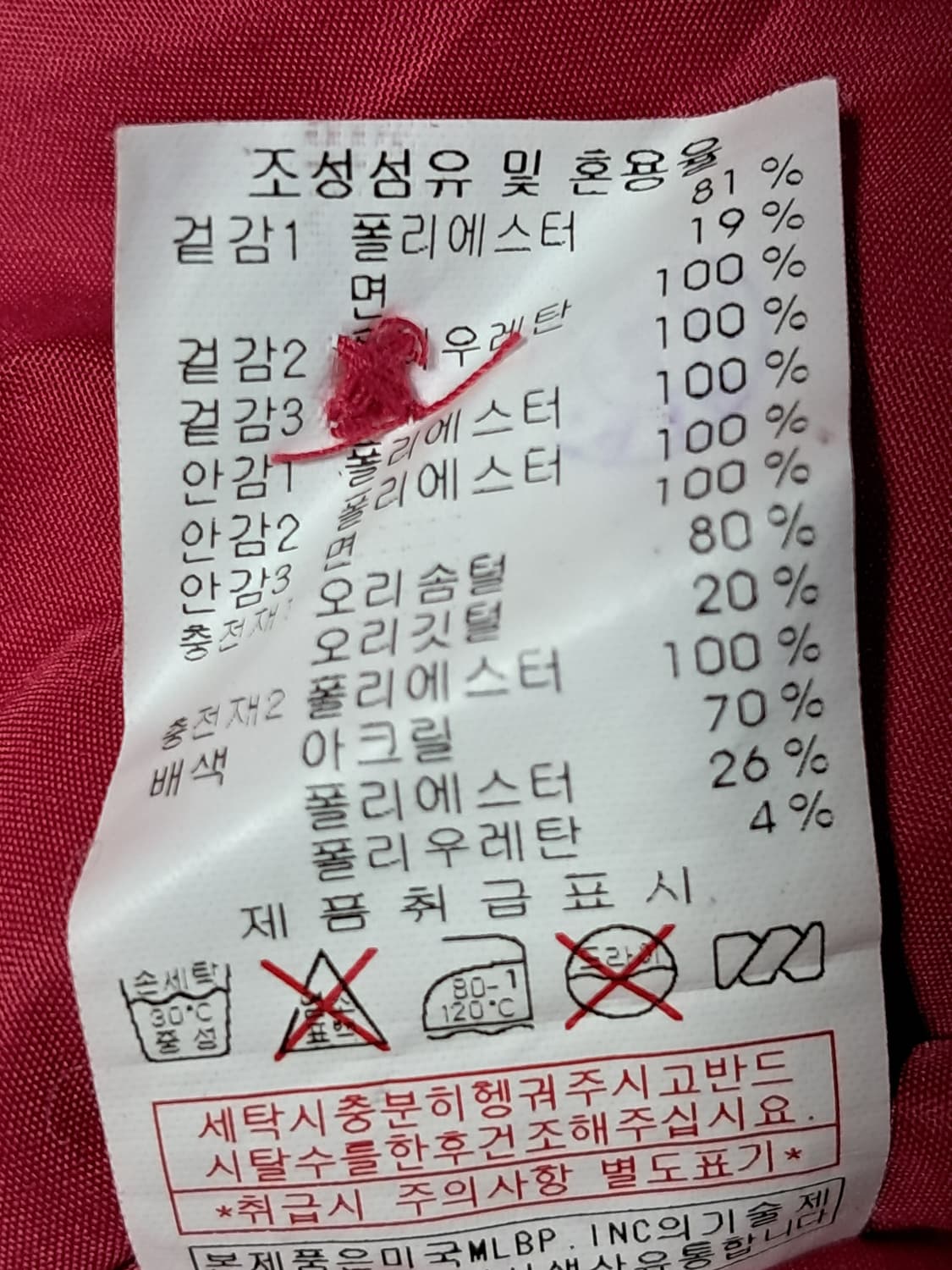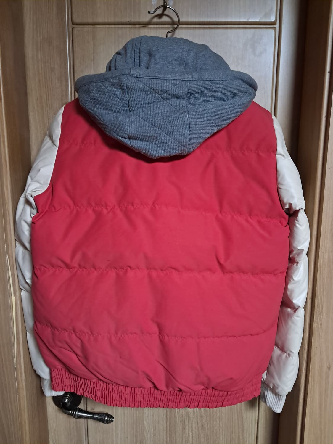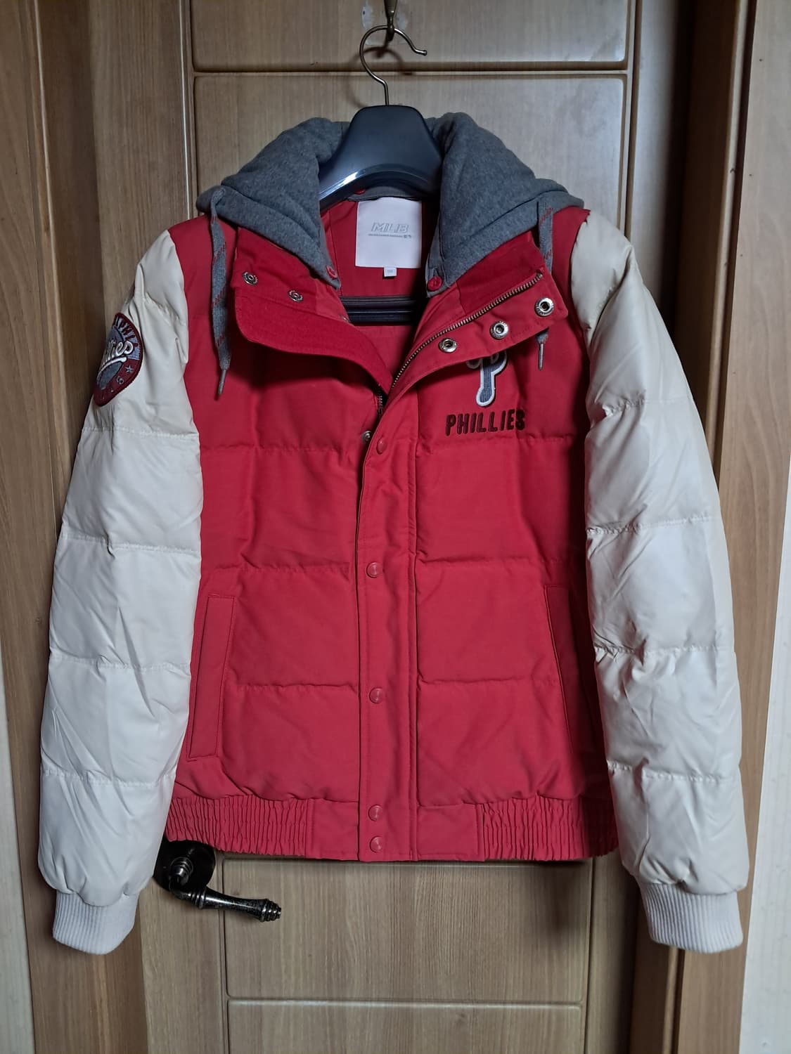 상태 깨끗합니다 새옷수준 사이즈90 가슴55 총장64 어깨42 팔60 겉감1 폴리에스터 겉감2 폴리우레탄 안감 나일론 오리솜털80 깃털20 두툼하고 탄탄한 재질 지퍼와 똑딱이 이중잠금 포켓2 후드 탈부착 레드 베이지 그레이 자수로고