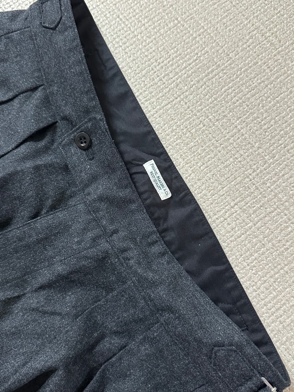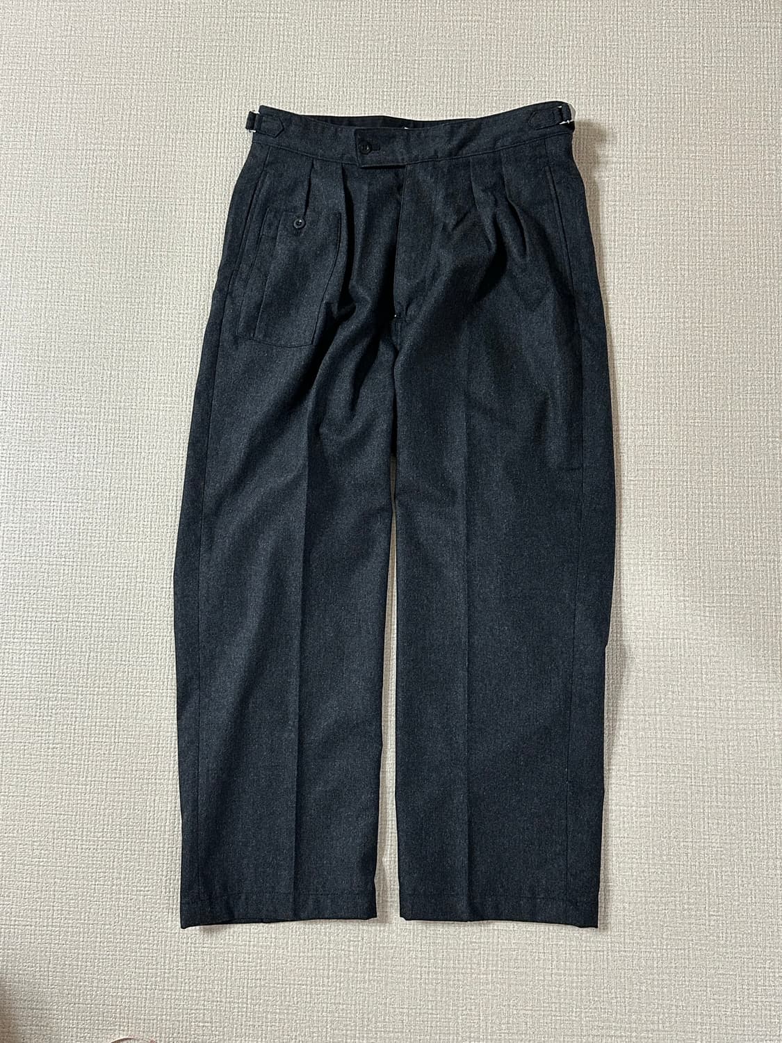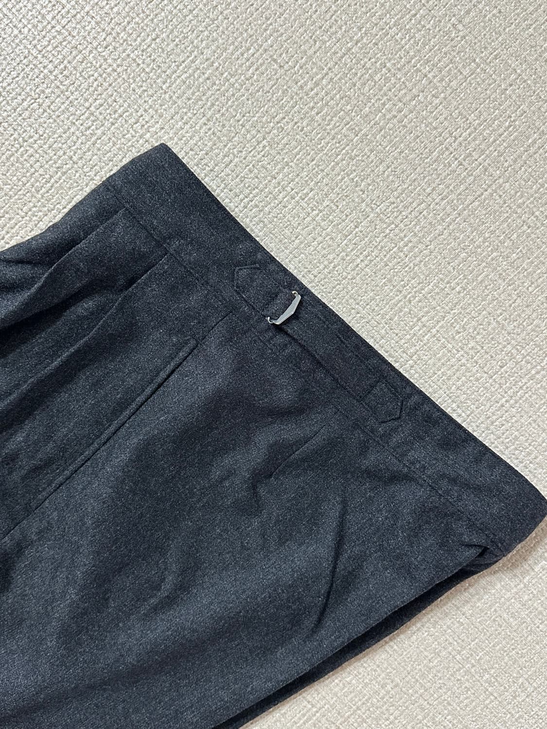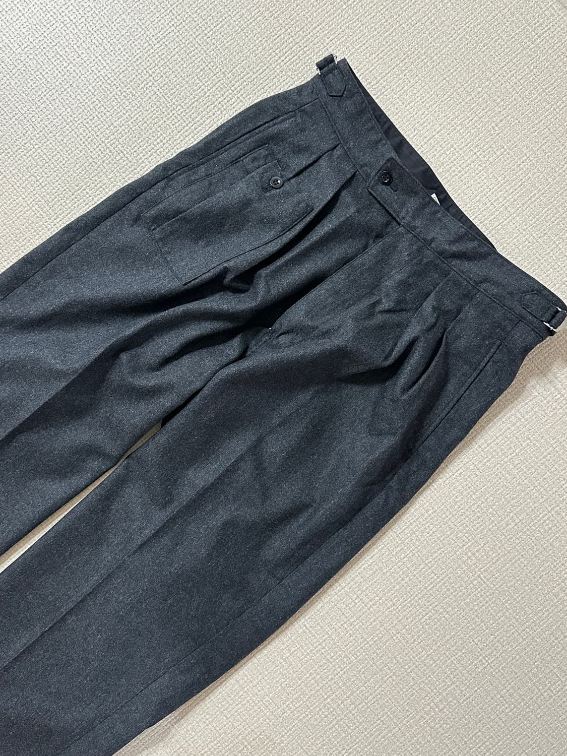 사파리 팬츠를 베이스로 파나마 클로즈 원단을 사용하여 자연스레 흐르는 실루엣을 구현한 팬츠입니다. 캐시미어 그리고 울 블렌딩 원단을 축융을 베풀고 밀드 가공으로 기모감과 품위있는 광택감이 고급스러운 제품입니다. 전면 포켓과 허리 양쪽에 위치한 어드저스터는 오리지널 사파리 팬츠가 가진 디테일을 그대로 채용하였습니다. 깊은 투턱이 설치되어 분명한 디테일과 편리함을 함유하고 있어, 워크웨어는 물론 클래식 스타일과도 조화롭게 어울리는 트라우저입니다. - 국내에서 50만원 후반대에 판매하던 상품으로 사이즈 미스로 반품하지 못하고 보관하던 제품입니다. 실내 시착 정도만한 컨디션입니다. 1 size 허리: 38 밑위: 32 인심: 65 (총장 97) 허벅지: 35 밑단: 23 추천사이즈: 170이하, 허리 30인치