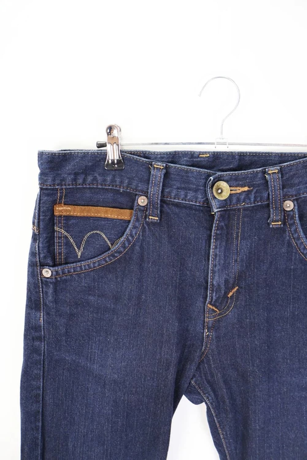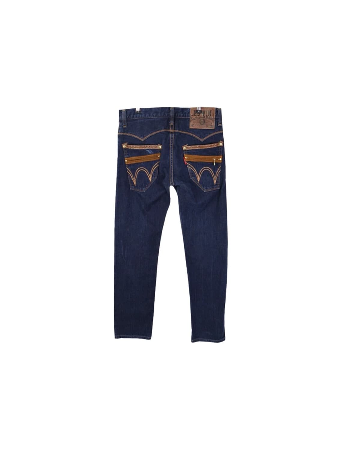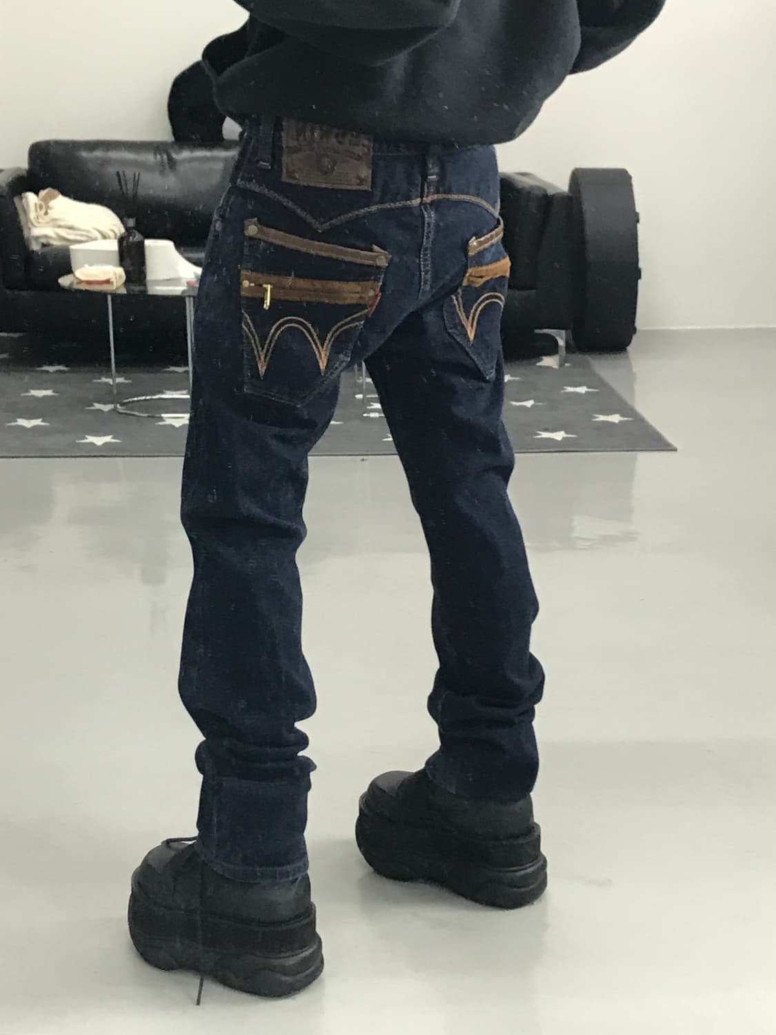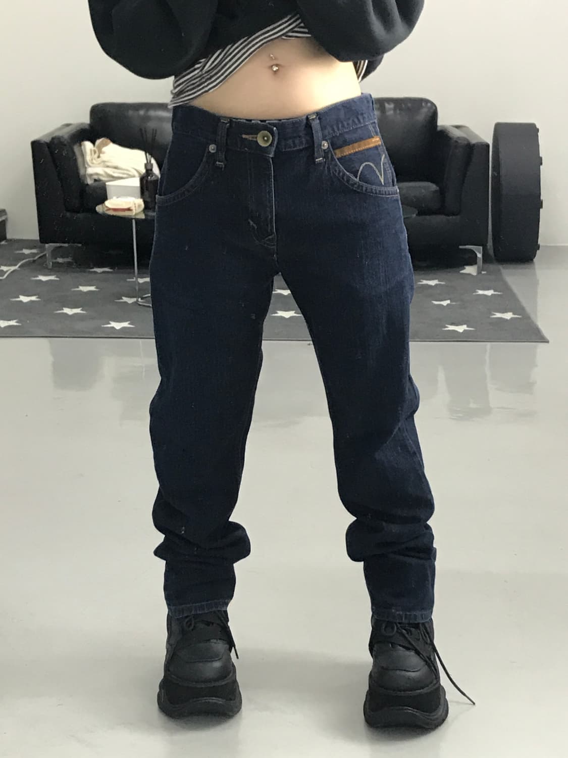 실측 사이즈(cm) 허리 : 41 허벅지 : 28 밑위 : 27 총장 : 102 빈티지 상품이라 미세 오염,하자 있을 수 있습니다. 신중한 구매 부탁 드립니다. 에드윈 403 웨스턴 디테일 데님팬츠 -> 미세 색빠짐 존재