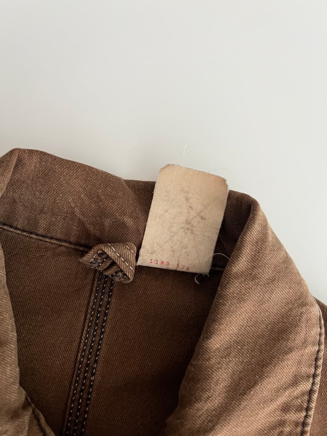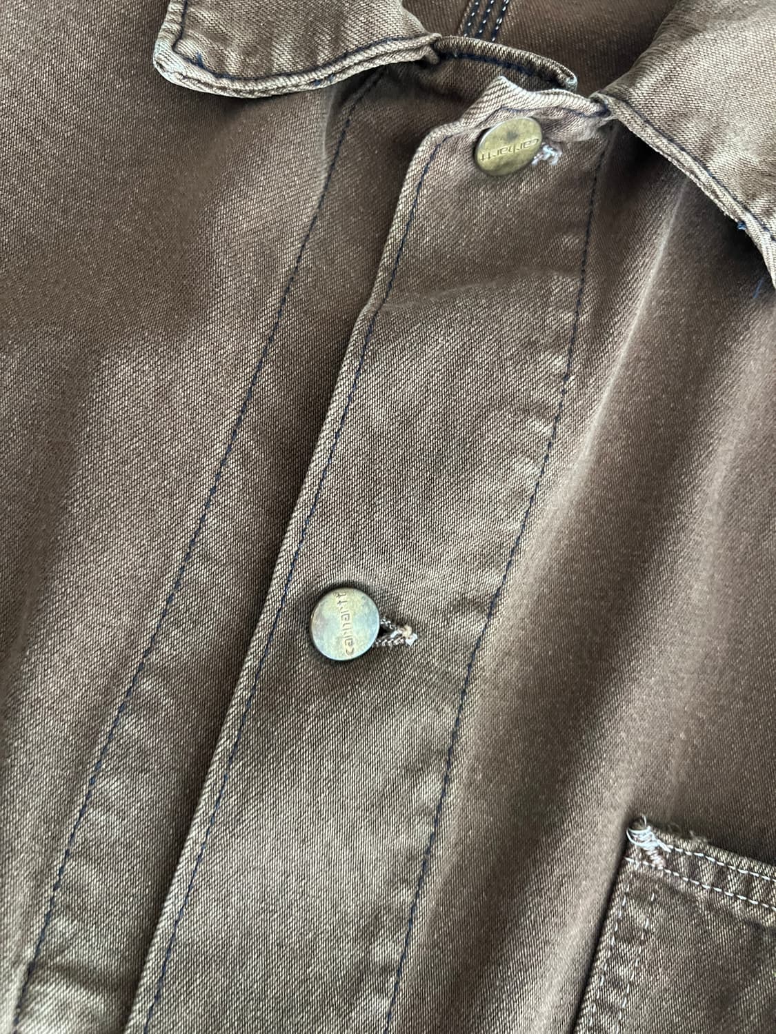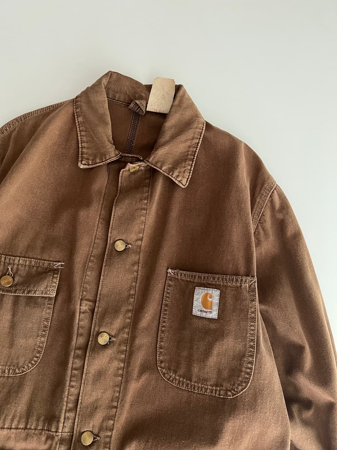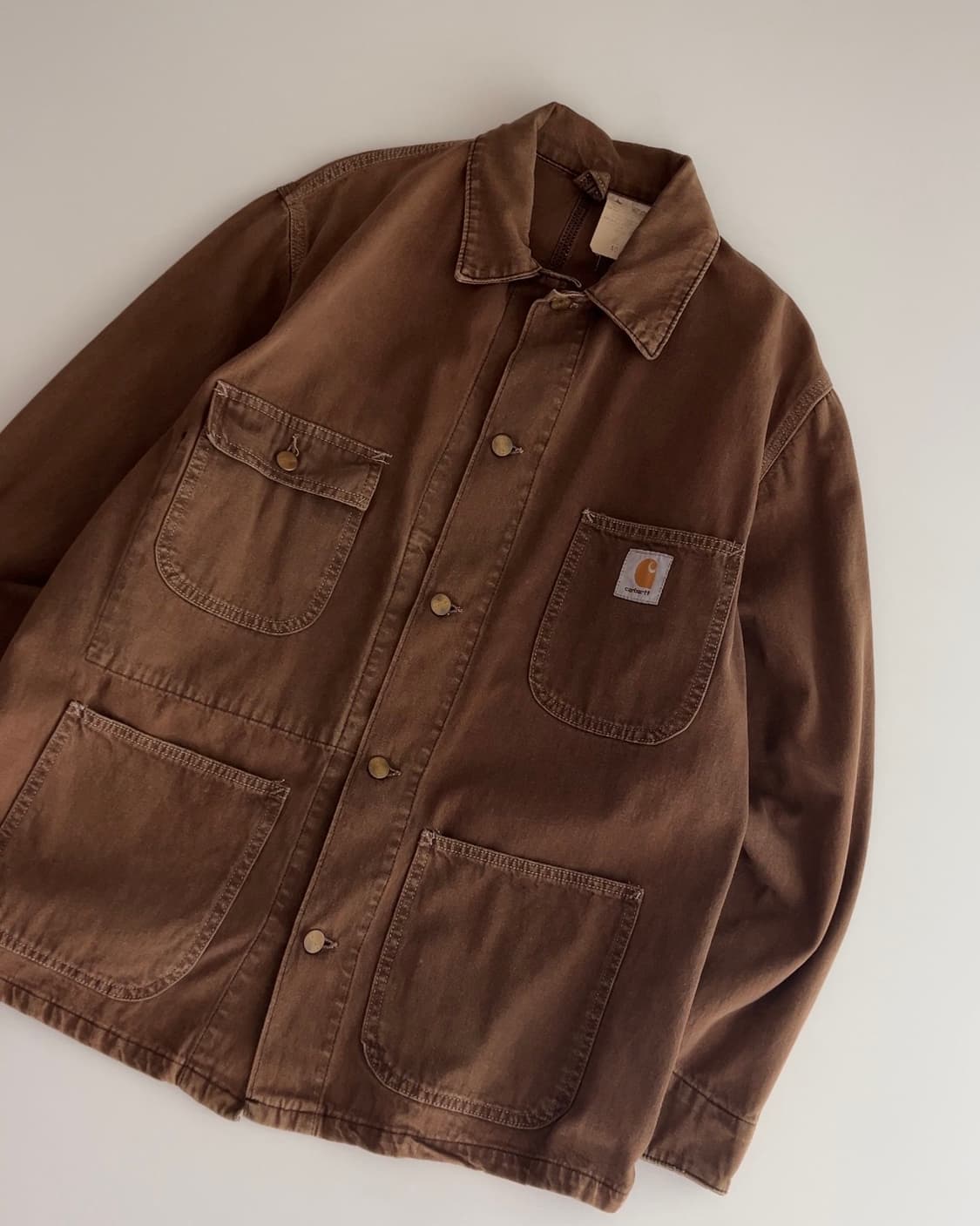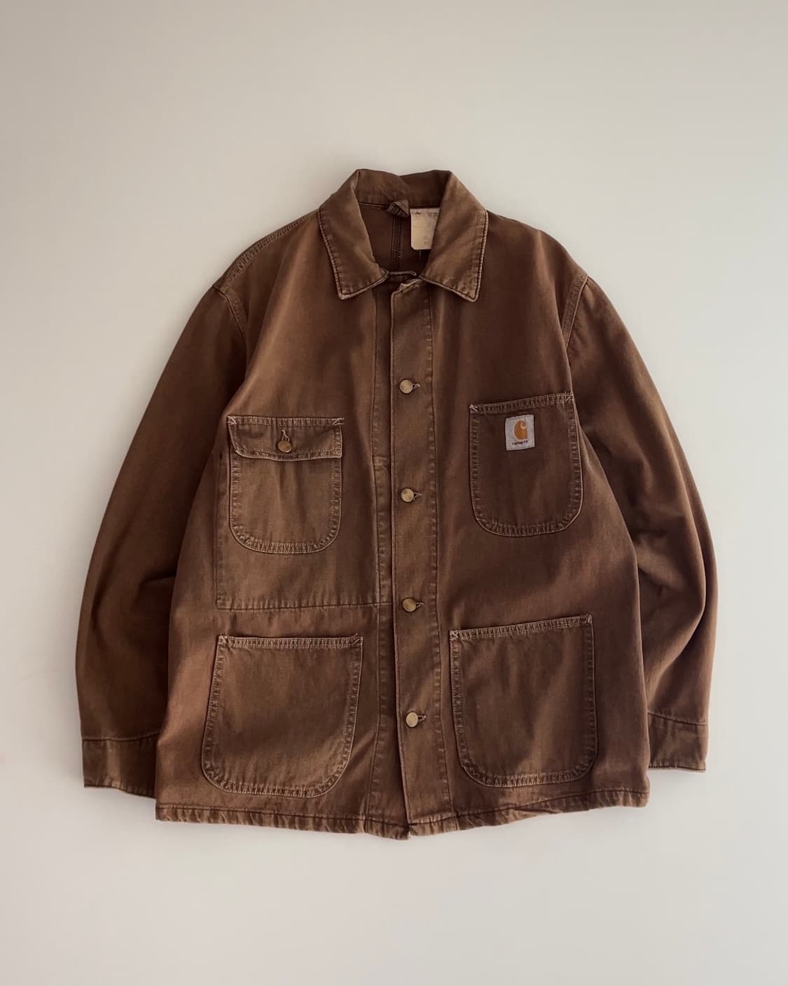 [브랜드 및 제품명] Carhartt Duck Canvas Chore Work Jacket 칼하트 덕 캔버스 초어 워크 자켓 / 40 사이즈 [제품 설명] 클래식한 미국 워크웨어 감성이 담긴 칼하트 초어 자켓입니다. 탄탄한 덕 캔버스 소재로 제작되어 내구성이 뛰어나며, 세월에 따른 자연스러운 워싱이 매력적으로 표현된 제품입니다. 전면 4포켓 디자인과 브라스 스냅 버튼, 아이코닉한 칼하트 스퀘어 로고 패치가 포인트로 자리잡고 있습니다. 90년대 초반 미국 생산기로 추정되며, 연식 대비 매우 양호한 컨디션을 유지하고 있습니다. ✔️ 세탁 및 케어 완료 / 수령 후 바로 착용 가능 ✔️ 표기 사이즈: 40 ✔️ 실측 (cm): 어깨 47 / 소매 61 / 가슴 55 / 총장 72 ✔️ 상태: 9 / 10 (연식 대비 사용감 매우 양호) ✔️ 특이사항: 90s USA 생산기 / 덕 캔버스 / 브라운 컬러 / 4포켓 디테일 💸 150,000원 🚚 배송비 별도 +3,000원 (제주 및 도서산간 +6,000원) ❗️구제 상품 특성상 교환·환불 불
