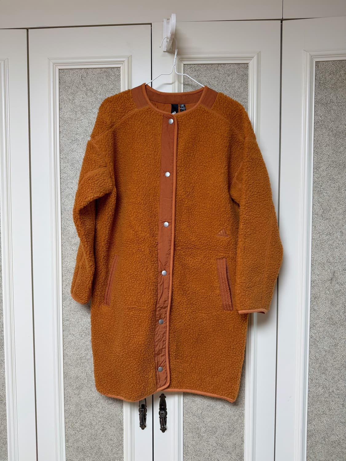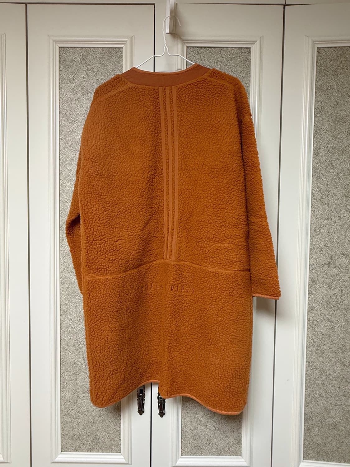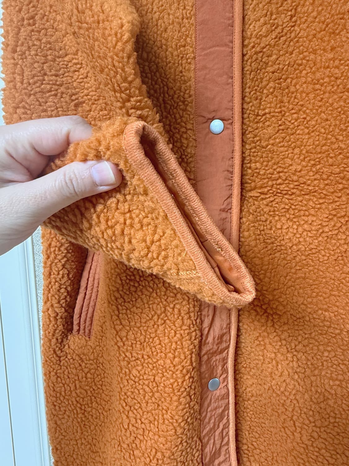 표기 라지사이즈이지만 입어보니 살짝 작게 나온 것 같아요. 평소 미듐 입으시는 분께 편하게 맞을 것 같아요! 톤다운된 오렌지 컬러에요. 접어서 보관했어서 약간 구김이 보이네요.