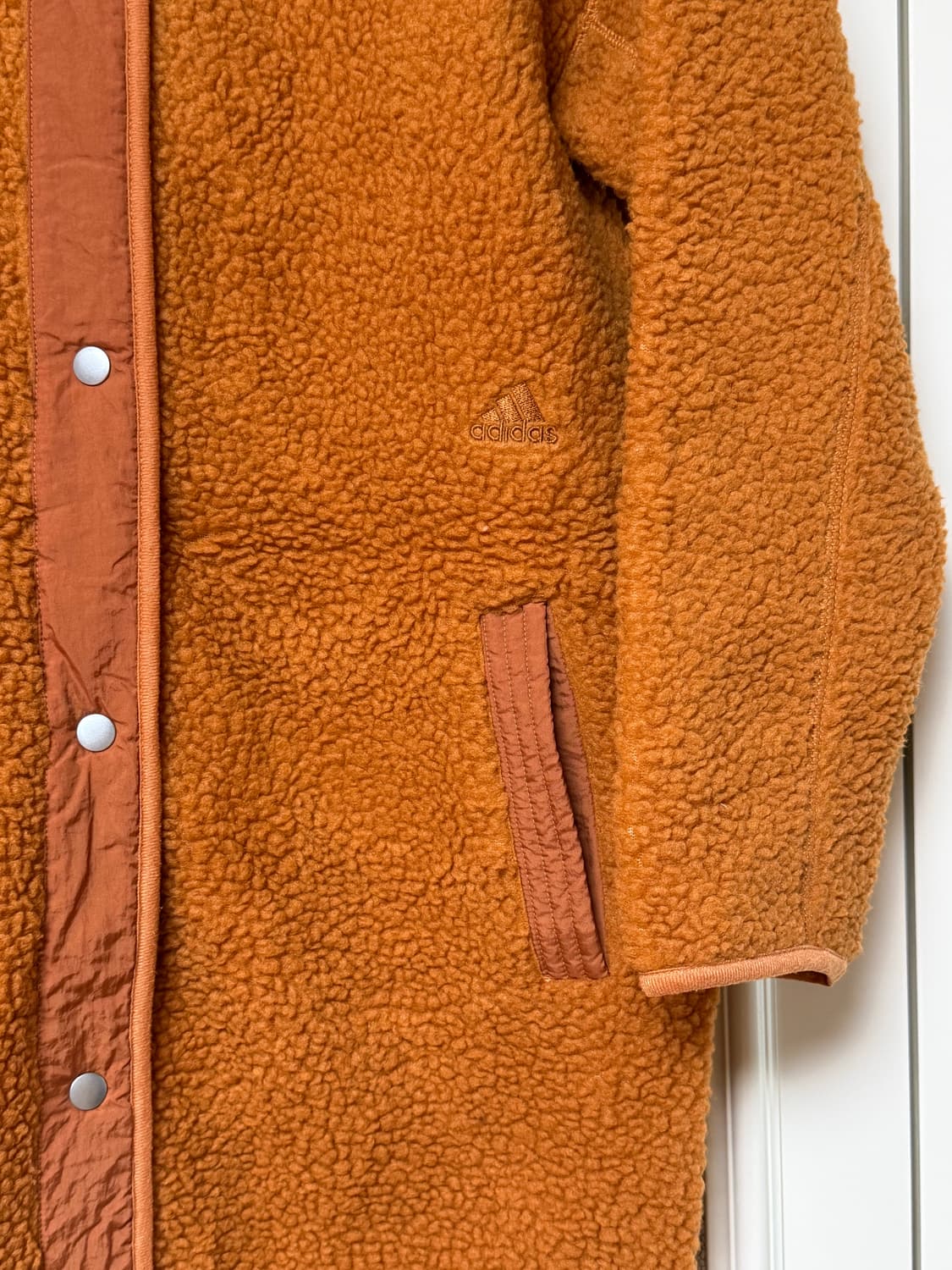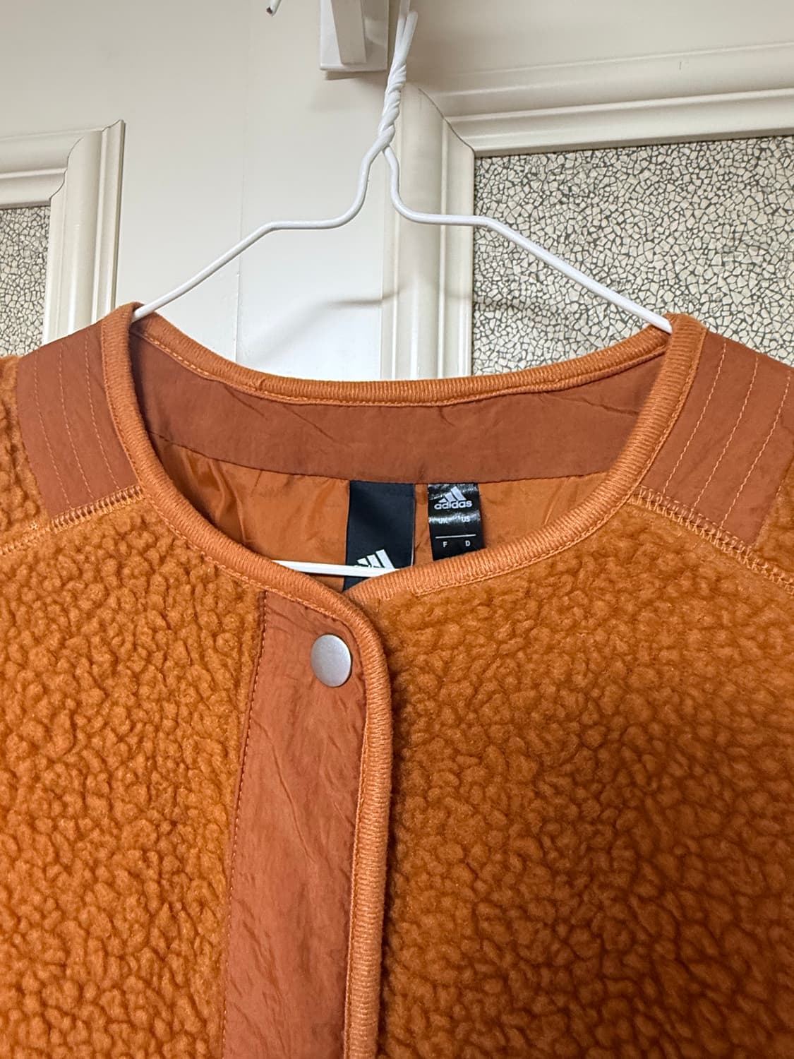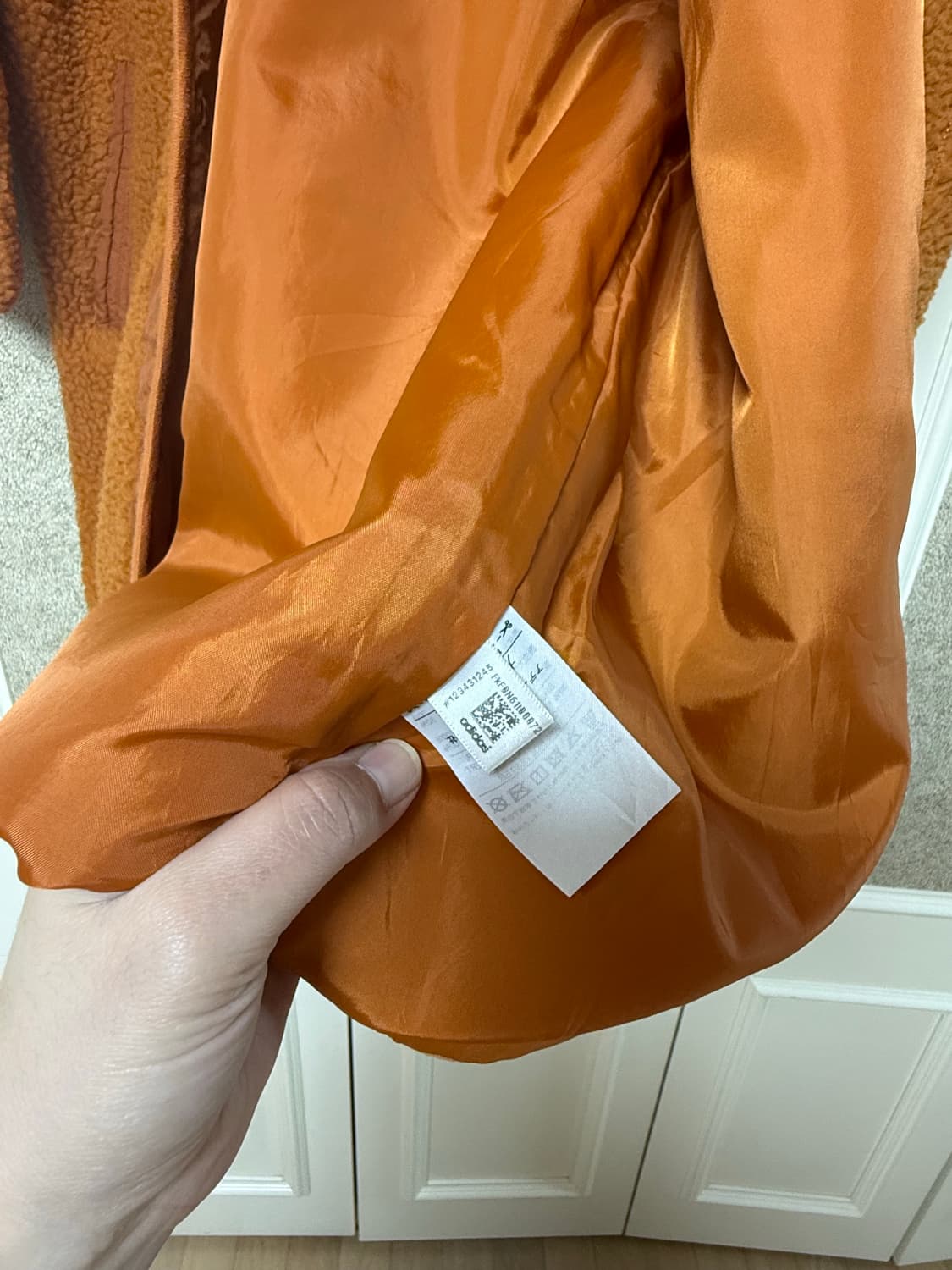 표기 라지사이즈이지만 입어보니 살짝 작게 나온 것 같아요. 평소 미듐 입으시는 분께 편하게 맞을 것 같아요! 톤다운된 오렌지 컬러에요. 접어서 보관했어서 약간 구김이 보이네요.