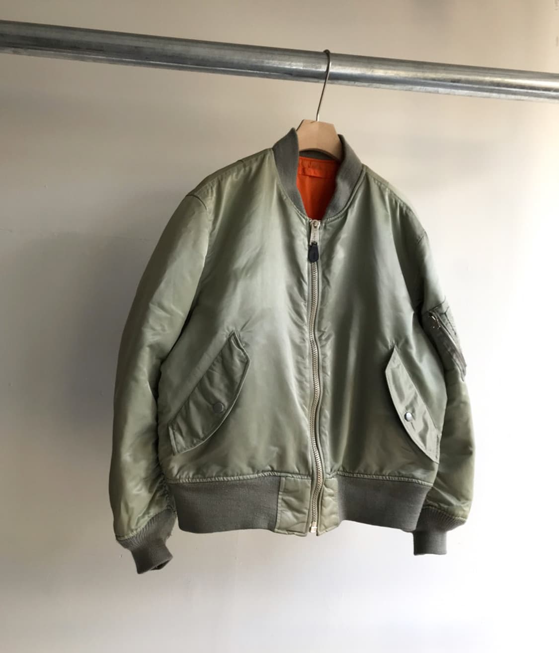 PRACT nylon heavy twill ma-1 jacket color : light sage green size : M 어깨 49 가슴 58 팔 61 총장 63 fabric : 나일론 100% - 소매 미세오염 외 전반적 사용감만 존재하는 준수한 컨디션 - 밀리터리 베이스의 Ma-1 항공 자켓 모티브의 디자인 - 헤비 나일론 소재의 탄탄한 재질감과 도톰한 두께감 - 리버시블로 착용 가능한 디자인 - TALON zipper