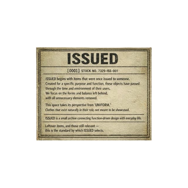 ISSUED는 지급되었던 것들에서 시작한다. 여전히 유효한 것들이 ISSUED의 기준이다. [NOTICE] ※ 모든 아이템은 ISSUED 기준에 따라 선별 및 관리된 상태입니다. ※ 전문 세탁 업체를 통해 탈취 및 오염 제거 과정을 완료했습니다. ※ 빈티지 특성상 사용에 따른 흔적 및 마모가 존재할 수 있습니다. ※ 명시된 상태 및 이미지에 포함된 사항은 아이템 상태의 일부로 간주됩니다. ※ 상기 이유를 포함하여, 빈티지 상품의 특성상 교환 및 환불은 불가합니다. ※ 판매 중인 상품을 두 개 이상 구매 시, 소정의 네고가 가능합